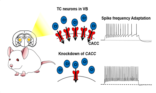 시상신경세포의 칼슘의존성 음이온채널에 의한 신호 전달 억제 현상 : 노란색으로 표시된 부분은 생쥐뇌의 시상 내 시상 전달핵위 위치를 표시한 것이다. 이 부분에 있는 시상신경세포에서 발현되는 칼슘의존성 음이온 채널(CACC)인 ANO2가 활성화돼 음이온이 안으로 들어오면 막전압 분극이 더 커지면서 신호자가억제(spike frequency adaptation)가 일어나게 된다. 이러한 음이온의 발현을 저해했을 경우에는 신호자가억제가 일어나지 않아 시상신경세포의 신호가 지속적으로 전달되게 된다.