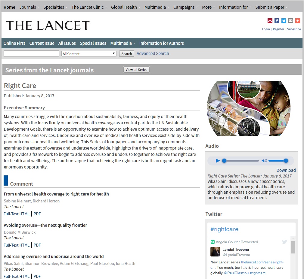 10일 연합뉴스는 국제 의학 학술지 '랜싯'의 신년호에 게재된 미국·영국·호주 등 의료전문가로 구성된 공동연구팀의 '올바른 의료' 특집 내용을 소개했다.