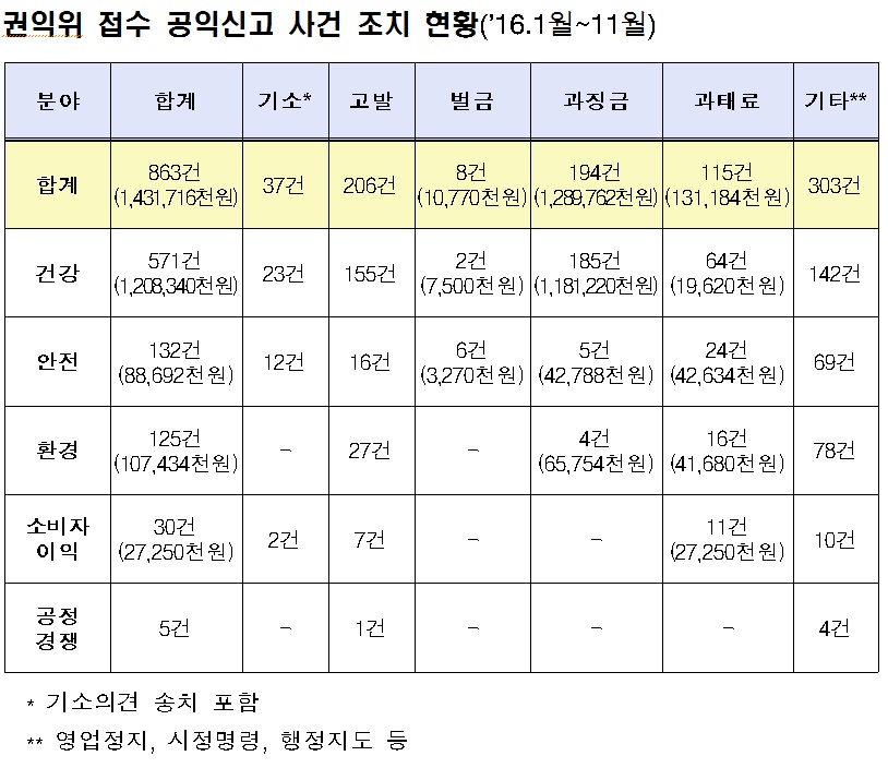 한편 권익위가 올해 공익침해행위가 확인된 863건(11월말 기준) 가운데 건강 분야가 571건(66.22%)으로 가장 많은 비중을 차지했다. 또한 863건 가운데 243건이 기소·고발됐으며, 317건에 대해 총 14억 3000여만원의 벌금·과징금·과태료가 부과됐다. 이외 303건에 대해서는 시설 폐쇄, 영업정지 등의 행정처분이 내려졌다.