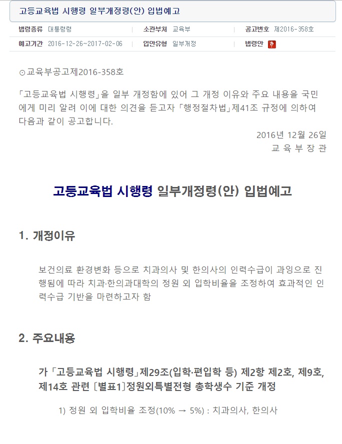 개정안에 따르면 고등교육법 시행령 제29조(입학.편입학 등) 제2항 제2호와 관련 별표1 정원외 특별전형 총학생수 기준 개정 중 한의사, 치과의사의 정원 외 입학비율을 현행 10%에서 5%로 조정하는 것을 주요내용으로 하고 있다.