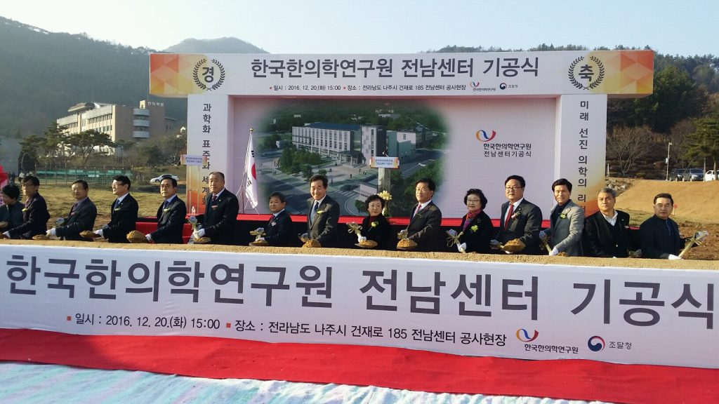 20일 한의학연구원 전남센터가 들어설 나주시 동신대 내 부지에서 열린 기공식에서 한의계 관계자들이 테이프 커팅을 하고 있다.