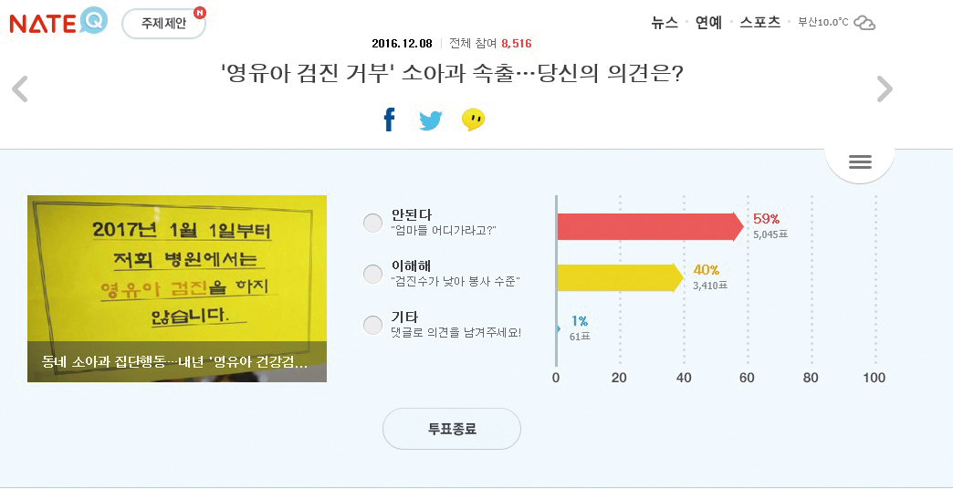 이런 가운데 포털사이트 네이트에서는 ‘영유아 검진 거부 소아과 속출…당신의 의견은?’을 주제로 소청과의사회의 영유아 건강검진 거부에 대한 네티즌들의 의견을 묻는 투표가 진행됐다.