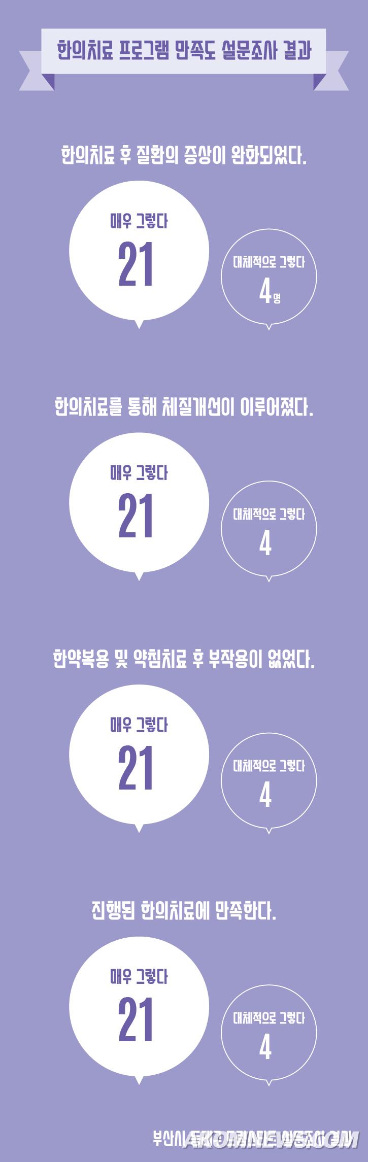 동래구 드림스타트에서 진행한 설문조사에서는 △한의치료 후 질환의 증상이 완화되었다 △한의치료를 통해 체질개선이 이뤄졌다 △한약 복용 및 약침치료 후 부작용이 없었다 △진행된 한의치료에 만족한다 등의 항목에 대해 25명의 참여자 중 21명이 ‘매우 그렇다’고 답변했으며, 4명은 ‘대체적으로 그렇다’고 답변했다. 또한 전체 만족도에서도 5점 만점에 21명(84%)이 5점을, 4명은 4점으로 답변하는 등 프로그램의 전체 만족도에서 높은 만족감을 나타내는 것으로 나타났다.