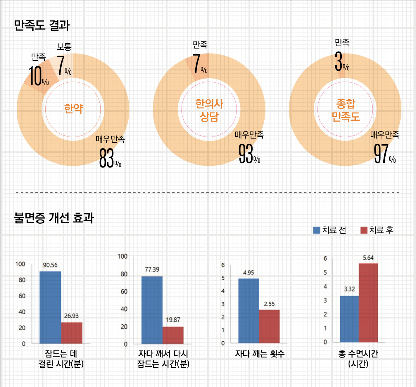 그 결과 불면증 개선 목표치를 150% 이상 달성했을 뿐 아니라 종합 만족도가 100%로 나타났을 만큼 한의약을 통한 불면증 치료 효과가 뛰어난 것으로 확인됐다.