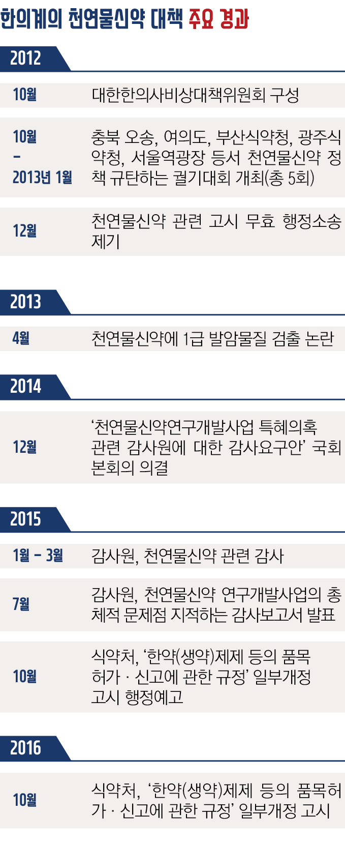 한의계는 2012년 6월부터 천연물신약 제도의 문제점을 인식한 이후 같은해 10월 안재규 위원장·김필건 수석부위원장 등으로 구성된 ‘대한한의사비상대책위원회(이하 비대위)’를 구성해 본격적인 대응에 나선 바 있다.