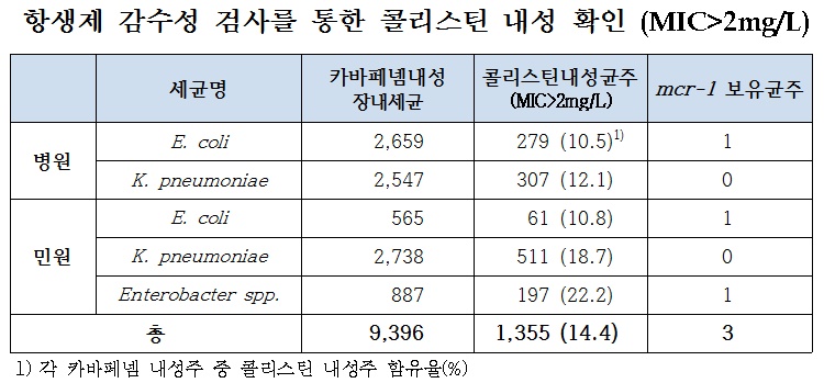 국내 인체감염 세균서 콜리스틴 내성 유전자 검출