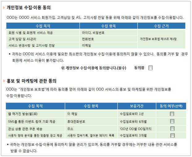 또 온라인에서 개인정보 수집 동의서를 작성하는 경우에는 '동의함' 체크 박스가 기본값으로 설정되어 있지 않도록 해야 하며, 홍보 및 마케팅을 목적으로 개인정보를 수집하면서 부가서비스 및 제휴서비스 제공 등으로 목적을 기재해서는 안된다.