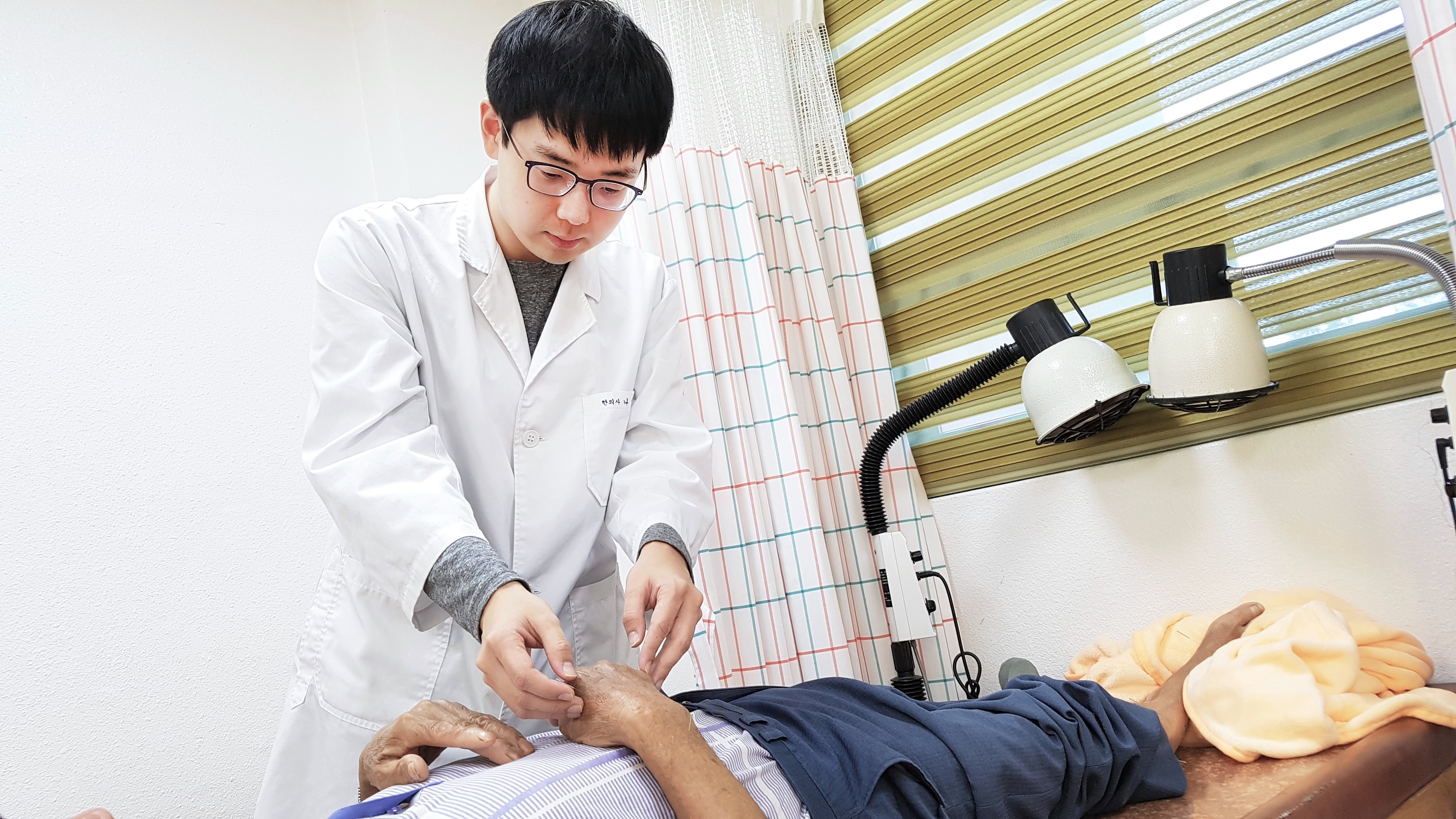 (전라남도 고흥군 풍양보건지소에서 공중보건의로 복무하고 있는 나경현 한의사가 환자에게 침 치료를 하고 있다.)