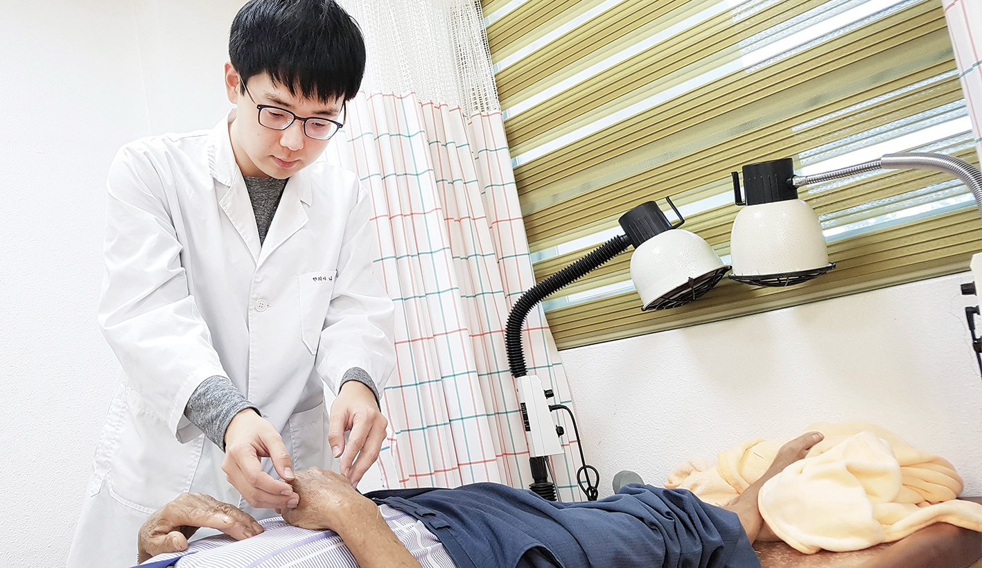 전라남도 고흥군 풍양보건지소에서 공중보건의로 복무하고 있는 나경현 한의사가 환자에게 침 치료를 하고 있다.