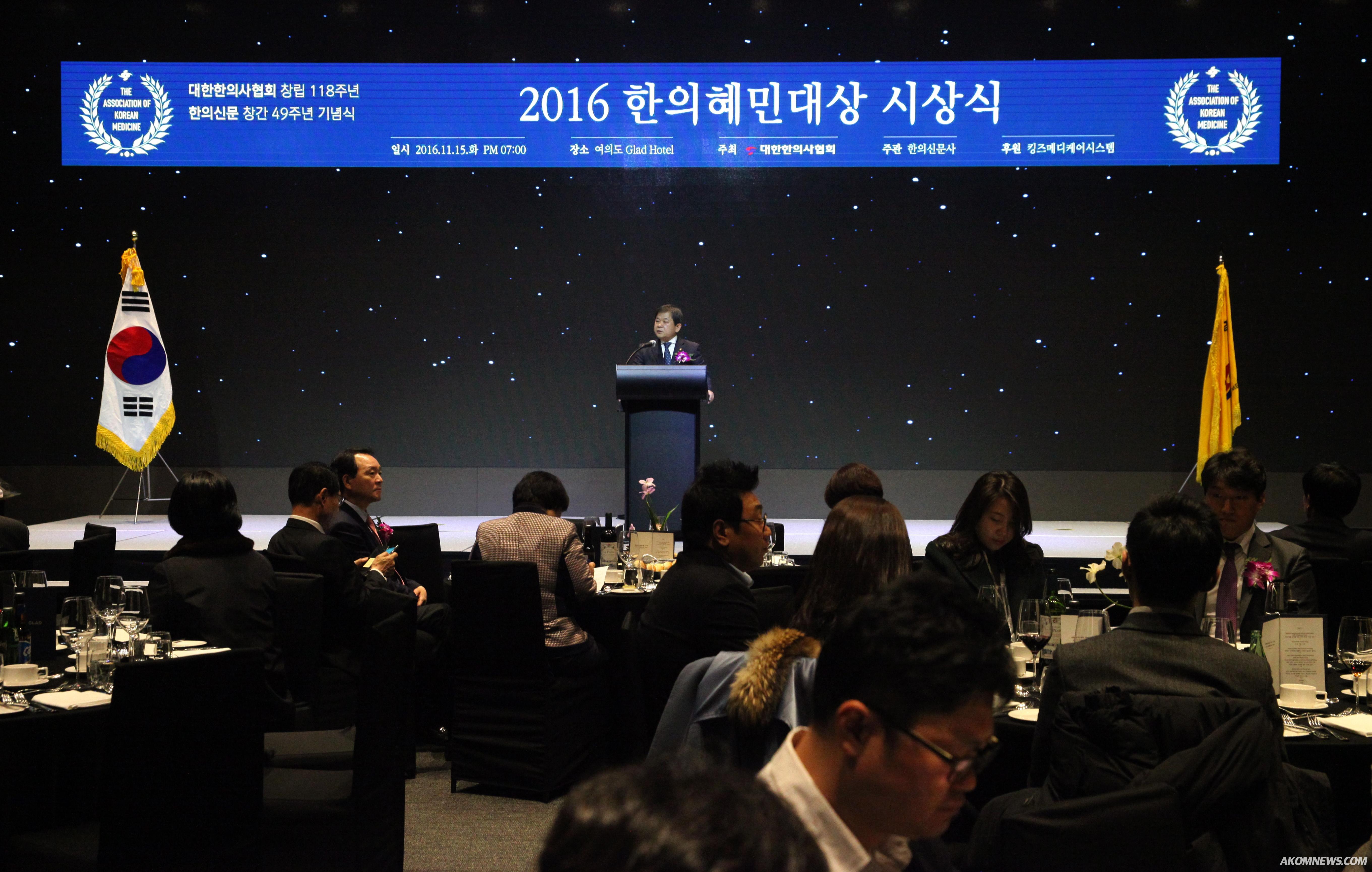 지난 15일 서울 여의도 글래드호텔에서 열린 '대한한의사협회 창립 118주년·한의신문 창간 기념식 및 2016한의혜민대상 시상식'에서 김필건 대한한의사협회 회장이 축사를 하고 있다.[한의신문=김지수 기자]