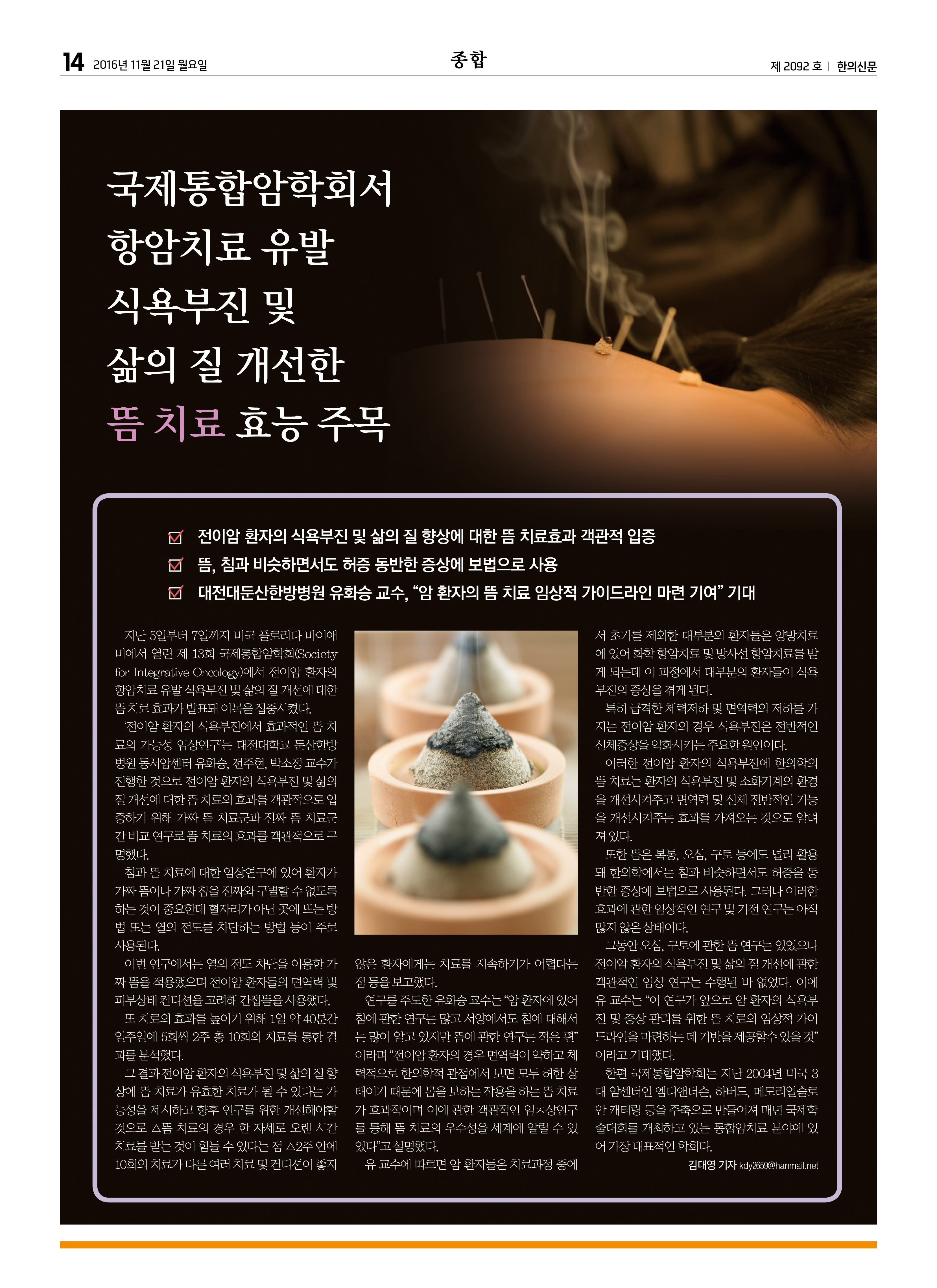 국제통합암학회서 항암치료 유발 식욕부진 및 삶의 질 개선한 뜸 치료 효능 주목