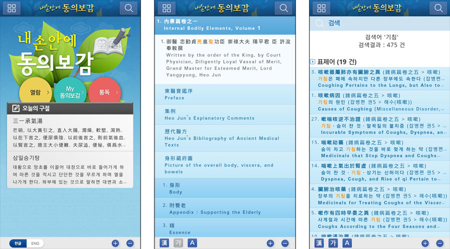 유네스코세계기록유산으로 등재된 기록유산인 동의보감이 어플리케이션으로 재탄생했다. 지난 2014년 동의보감의 한자원문과 국·영문 콘텐츠가 공개돼 4개월 만에 1만여 건 다운로드, 월 평균 6000회 이상 사용됐다. 미국, 프랑스, 일본, 중국 등에서 누적 사용량의 4%를 차지하고 있다. 앱 개발로 전 세계인들까지 누구나 빠르고 쉽게 동의보감을 접할 수 있게 됐다.