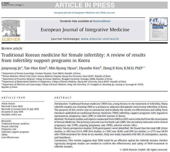 [한의신문=윤영혜 기자]국내 지자체에서 추진했던 한의여성난임사업의 결과가 SCI(E)급 국제학술지에 실렸다.