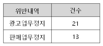 국회 보건복지위원회 소속 남인순 더불어민주당 의원이 식품의약품안전처로부터 제출받은 국정감사 자료에 따르면 지난 2014년부터 올해 8월까지 행정처분을 받은 34건 가운데 21건이 광고업무정지 처분을 받은 것으로 나타났다. 판매업무정지 처분을 받은 건수는 13건으로 이중 4건에 과징금이 부과됐다.