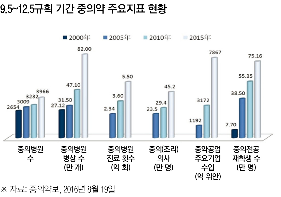 1996년 중국 공산당중앙과 국무원은 전국위생공작회의를 개최하고, "중서의병중中西医并重"을 보건사업 기본방침으로 명시하였다. 이후 현재까지 20여 년 동안 중의는 서의와 동등한 지위를 가지고, 정부의 전폭적인 지원 아래 큰 발전을 이뤄나가고 있다. 실제로 중국경제개발9차 5개년 규획("9.5", 1996-2000년)에서 중국경제개발 12차 5개년 규획("12.5", 2011-2015)에 이르기까지 중의약 주요지표는 비약적으로 증가하였다. 주요지표 가운데 중의병원 병상 수, 중약공업 주요기업 수입, 중의전공 재학생 수의 증가추세가 두드러졌다.
