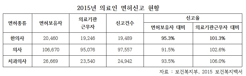 한편 2015년 의료인 면허신고 현황(2015 보건복지백서)에 따르면 한의사는 면허 보유자 대비 95.3%, 의료기관 근무자 대비 101.3%가 면허 신고를 완료해 의료인 중 가장 높은 신고율을 보였다.