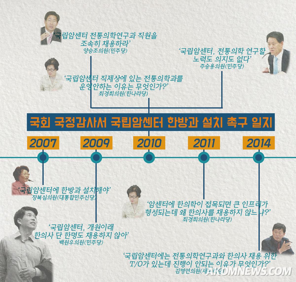 최경희 의원은 지난 2011년 국정감사에서도 국립암센터에 한의학이 접목되면 큰 인프라가 형성되는데 왜 한의사를 채용하지 않는지를 따졌고 2014년 국정감사에서 김명연 새누리당 의원은 국회와 국민의 요구를 수용할 생각이 있기는 한 것인지를 반문했다.