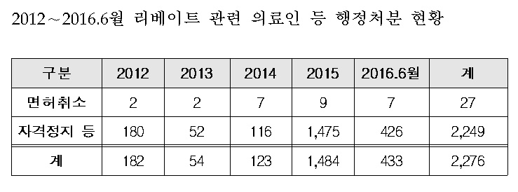 강석진 국회 보건복지위원회 위원(새누리당)이 복지부로부터 제출받은 자료에 따르면 리베이트 관련 의료인에 대해 최근 5년간 2200여건의 행정처분을 내린 것으로 나타났다.