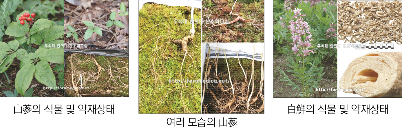 위의 내용에서 뚜렷하게 차이를 나타내고 있듯이, 山蔘 Ginseng Radix(wild)은 補益藥에 속하며, 白鮮皮 Dictamni Cortex(root)는 淸熱藥에 속하여, 2 한약재 사이에는 약효면에서 공통점이 전혀 없으므로 당연히 구분해서 사용되어져야 할 약재이다.