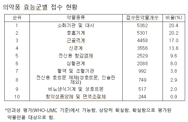 이와 함께 의약품 효능군별로는 소화기관 및 대사 관련 약물에서 5362건(20.4%)의 부작용이 접수됐으며, △호흡기계(5301개·20.2%) △근골격계(4458개·17.0%) △신경계(3556개·13.6%) △전신용 항감염제(2529개·9.6%) △심혈관계(2088개·8.0%) △혈액 및 조혈기관(992개·3.8%) △전신용 호르몬 제제-성호르몬, 인슐린 제외(749개·2.9%) △비뇨생식기계 및 성호르몬(517개·2.0%) △항악성종양제 및 면역조절제(244개·0.9%) 등으로 나타났다.