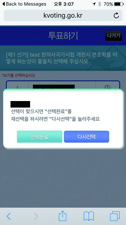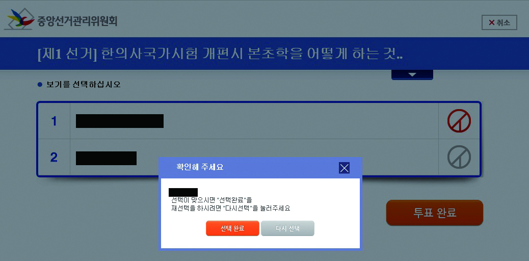 ④ 투표가 제대로 됐는지 확인하는 화면이 뜨면 제대로 선택됐으면 ‘선택완료’를, 재선택을 하려면 ‘다시선택’을 누른다. ‘다시선택’을 누르면 다시 투표하면 된다.