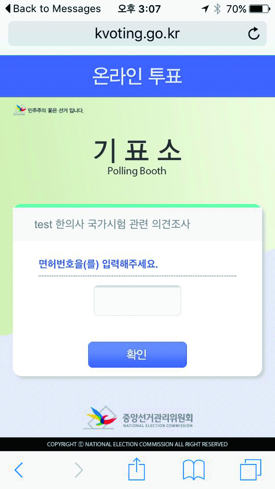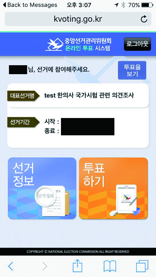 [한의신문=김대영 기자]온라인 투표가 시작됐으니 투표에 참여하라는 문자 또는 이메일이 회원들에게 전송되면 투표 기간 내에 PC 또는 휴대전화로 투표에 참여하면 된다.