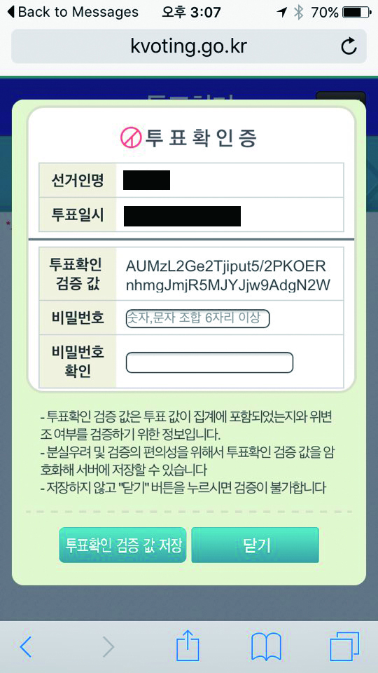 ⑤ ‘투표확인증’ 화면이 나온다. 투표확인 검증값은 투표 값이 집계에 포함됐는지와 위변조 여부를 검증하기 위한 정보다. ‘닫기’ 버튼을 누르면 개표 후에 투표값 반영 여부를 확인할 수 없다. ‘투표확인 검증 값 저장’을 하려면 선거인이 비밀번호를 입력한 후 ‘투표확인 검증 값 저장’을 누르면 된다. ‘닫기’를 클릭하려면 비밀번호 지정을 할 필요는 없다.