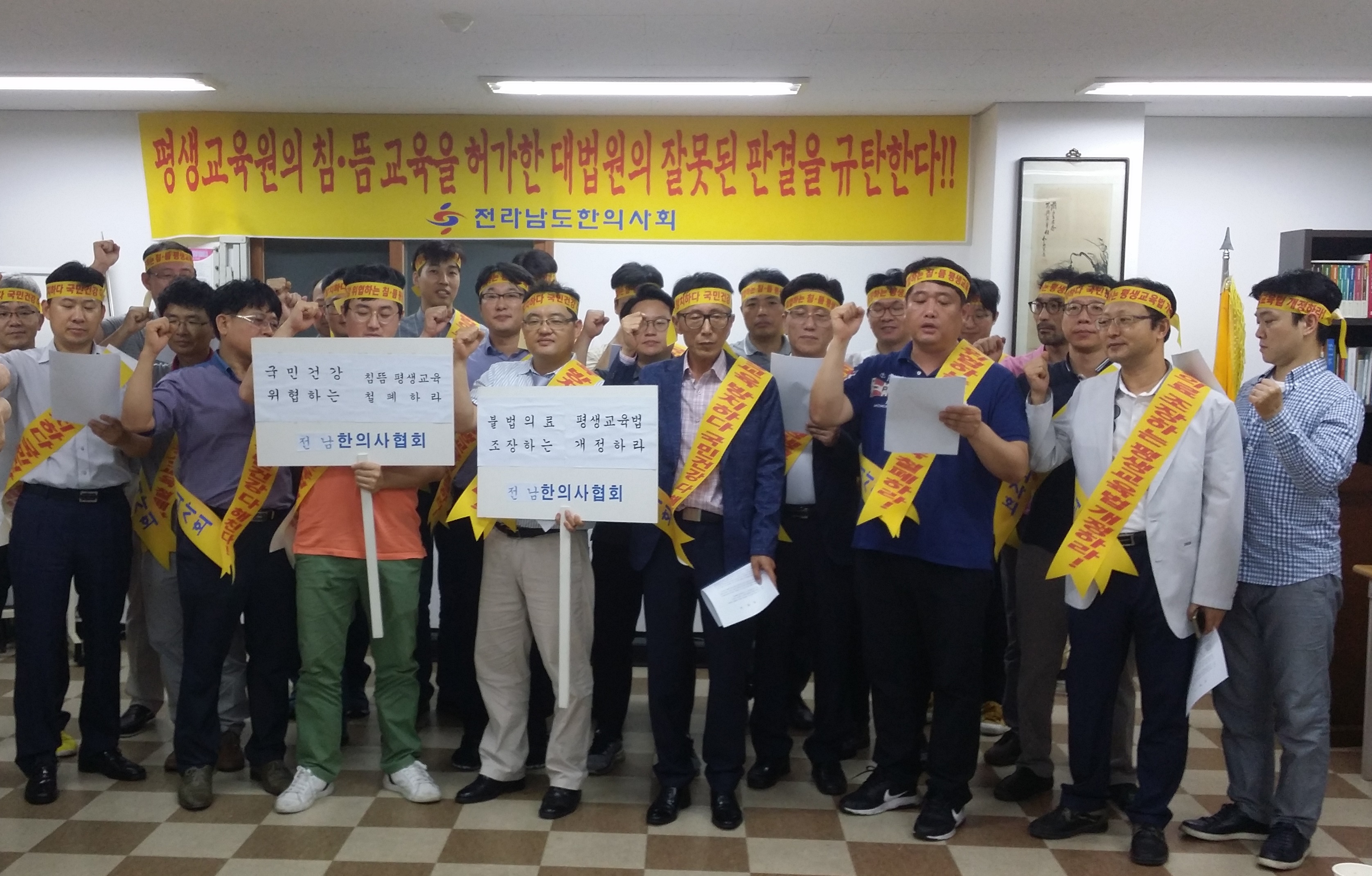이러한 가운데 전라남도한의사회 회원들은 지난 7일 전남지부 사무실에 모여 무면허 불법의료행위를 방조하는 사법부의 각성과 국민의 건강을 위협하는 침·뜸 평생교육의 철폐를 요구하며 이번 대법원의 판결을 강력히 규탄하는 성명서를 발표했다.