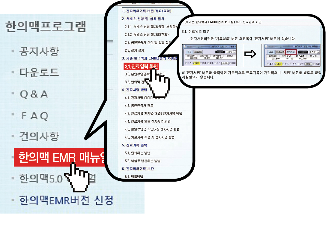 ‘한의맥 전자의무기록(EMR) 매뉴얼’, ‘한의맥 5.0 매뉴얼’엔 프로그램의 사용 설명서가 수록돼 있다. 한의맥 전자의무기록(EMR) 매뉴얼에선 자의무기록 버전 개요 △서비스신청 및 설치 절차 △기존 한의맥과 버전과의 차이점 △전자서명 방법 △진료기록 출력 △전자의무기록 보관 △주의사항 등의 궁금증을 해결할 수 있다.