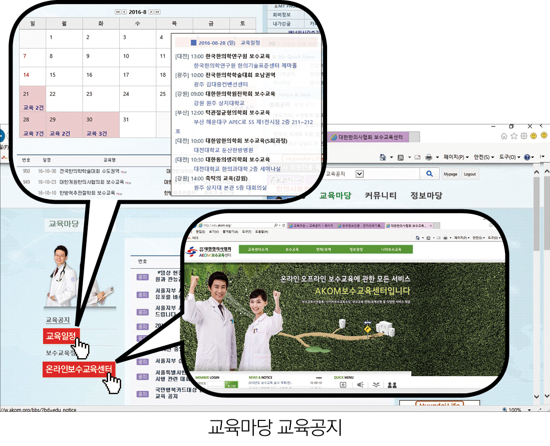 대한한의사협회 홈페이지(http://akom.org/)엔 알림마당·건강보험에 이어 ‘한의119’·‘교육마당’ 메뉴도 포함돼 있다. 이들 메뉴는 한의사 회원 아이디로 로그인하고, 비밀번호를 입력하면 상단 중앙에서 찾아볼 수 있다.