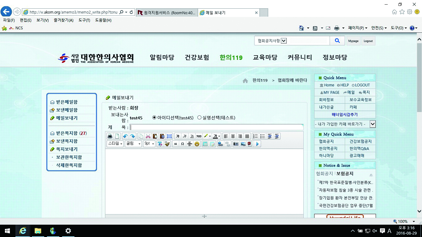 ‘협회장께 바란다’는 회원 개인이 김필건 한의협 회장에게 직접 메일을 보낼 수 있는 공간이다. 해당 메뉴를 누르면 바로 메일을 보낼 수 있는 페이지가 만들어진다. 실명 공개 여부를 선택할 수 있다.