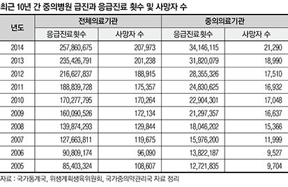 중의의료기관의 응급진료횟수는 3400만건이며 이는 전체 의료기관 응급진료횟수의 13%에 해당된다.