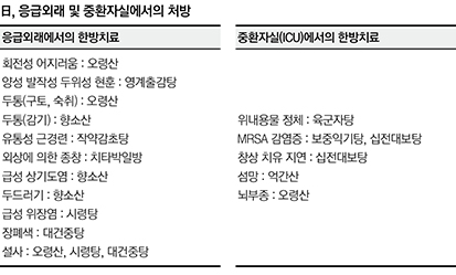 대표적으로 한방의약학잡지(Vol23. 2015)에서는 메치실린내성포도상구균(MRSA) 감염된 중증 화상환자의 항생제 대응이 곤란해 ‘십전대보탕’을 투여, 병세가 개선된 사례와 함께 중환자실(ICU)에서 다빈도로 발생하는 부종환자에게 ‘오령산’을 처방, 혈관 투과성 항진을 억제하는 기전으로 부종을 억제시킬 수 있다고 소개했다.