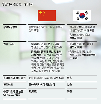 반면 중국은 중의약사업발전 5개년 규획에 중의급진학(응급의학) 발전사업을 편입시켜 정부가 적극적으로 육성해오고 있다. 최근 발표된 중의약발전 ‘135’규획(2016~2020년)에서도 ‘중의약 응급치료 대오와 조건의 건설 강화’라는 목표가 눈길을 끈다.