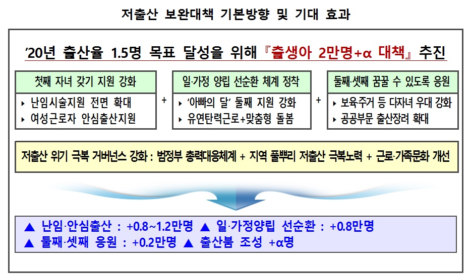 이번에 마련된 보완대책은 3차 저출산 계획의 시행 첫 해인 올해 1~5월까지의 출생아 수가 지난해 같은 기간에 비해 약 1만명 감소한데 따른 긴급 보완대책으로 2020년까지 합계출산율 1.5명을 달성하기 위해서는 내년에 최소 2만명 이상 추가 출생이 필요하다는 의미에서 ‘출생아 2만명+α 대책’으로 명명됐다.