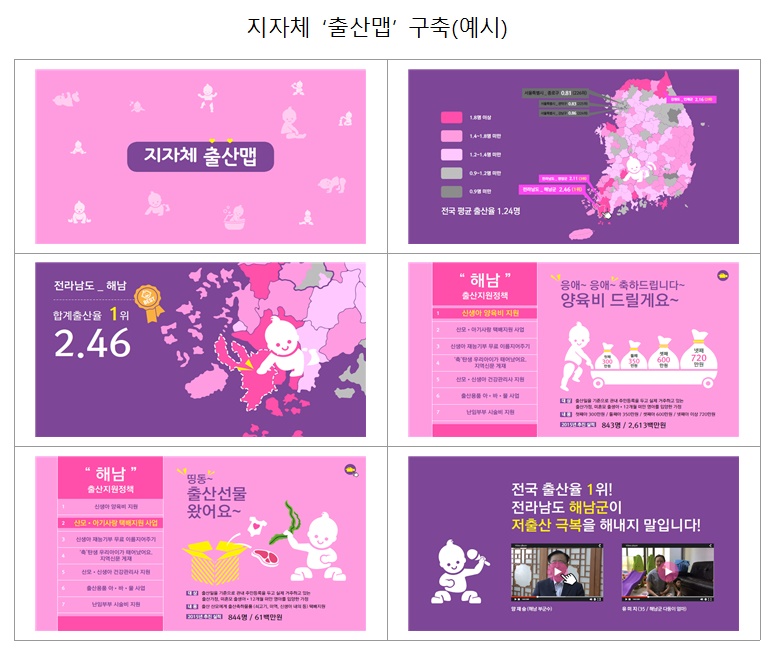행정자치부(이하 행자부)가 25일 발표한 ‘지자체 출산율 제고방안’에 포함된 지자체 ‘출산맵’은 17개 시·도 및 226개 시·군·구별 출산 통계와 각종 지원서비스, 저출산 정책 평가결과 등에 대한 정보를 제공한다.