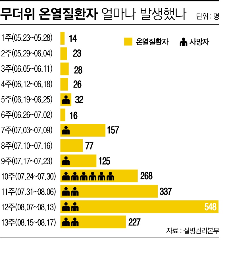 특히 무더위가 본격적으로 시작된 지난달 17일부터 약 한 달간 발생한 온열질환자는 1605명에 이른다. 사망자도 역대 최고인 16명을 기록했다.