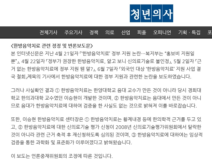 청년의사신문, ‘한방음악치료 관련 정정 및 반론보도문’ 게재
