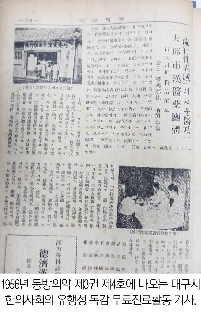 [한의신문]1956년 간행된 『東方醫藥』제3권 제4호에는 ‘유행성 독감과 싸운 醫功. 대구한의약단체–시민의 무료진료로 높은 의료봉사 칭송하자’라는 제목의 기사가 게재돼 있다.