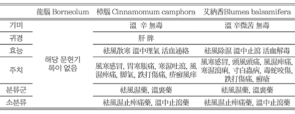 ② 천연물상태(樹幹 및 잔가지, 잎)의 약효에서, 樟腦와 艾片(艾納香)은 모두 祛風濕, 溫裏의 효능으로 유사한 반면, 龍腦에 대한 내용은 언급된 바 없다.