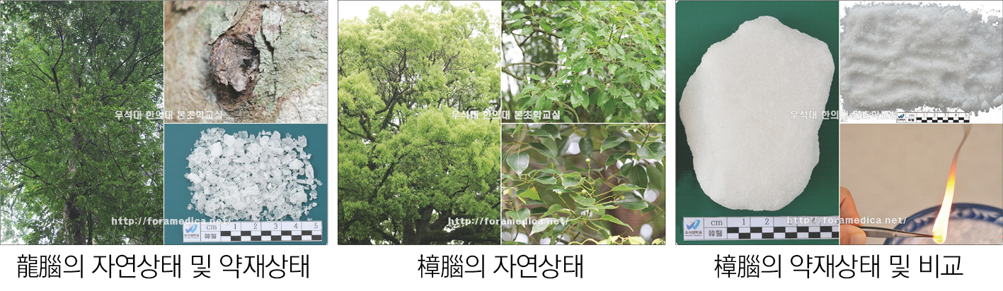한약재의 일부분인 합성한약재의 경우 다양한 제법 및 모양을 형성하고 있어 곤란을 겪는 경우가 많다. 이번에 소개할 龍腦와 樟腦도 이에 해당되는 한약재인데, 開竅醒神의 효능을 나타내는 대표적인 처방인 牛黃淸心元 등에서 응용되어지고 있는 龍腦와 주로 외용으로 疥癬瘡瘍 등에 응용되나 開竅僻穢의 효능으로 麝香 등과 배합되었던 樟腦는 공정서의 규정에도 불구하고 유통시장에서는 혼란스런 이름으로 상호 유통되어지고 있는 것을 볼 수 있다.