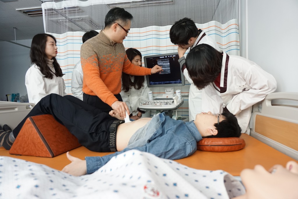 (전라북도 익산에 위치한 원광대학교 한의과대학 1층 임상술기센터에서 초음파 기기 사용 수업이 진행되고 있다.)