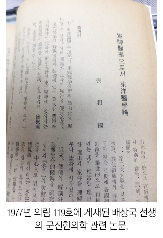 kni-web[한의신문]1977년 4월 한의학 전문 학술지 『醫林』제119호에는 裵相國의 ‘軍陣醫學으로서 東洋醫學論’이라는 제목의 글이 게재되어 있다. 저자 裵相國(맹몰연대 미상) 先生은 경희대 한의대를 제1기로 1948년 입학해 졸업한 한의사다. 그는 다년간 軍陣韓醫學에 관심을 가지고 연구하면서 한의학이 군진의학으로서 우뚝 서기 위해 방안을 제시하게 된 것이다. 그의 거주지에 대해 부산시 동래구 수원동이라고 기록돼 있다.