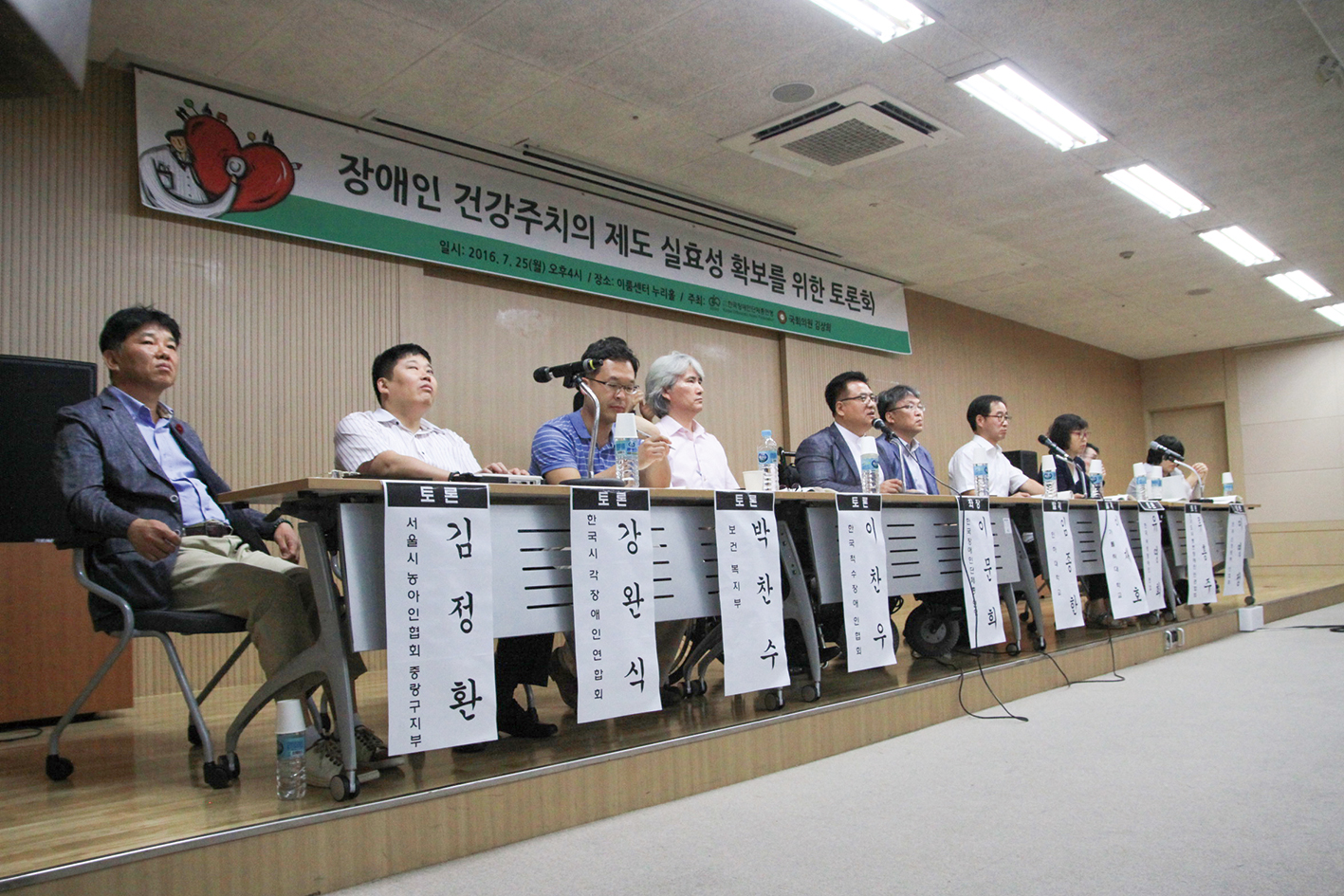 지난달 25일 여의도 이룸센터에서 한국장애인단총연맹이 개최한 ‘장애인 건강주치의제도 실효성 확보를 위한 토론회’에서 참석자들이 발제를 하고 있다.