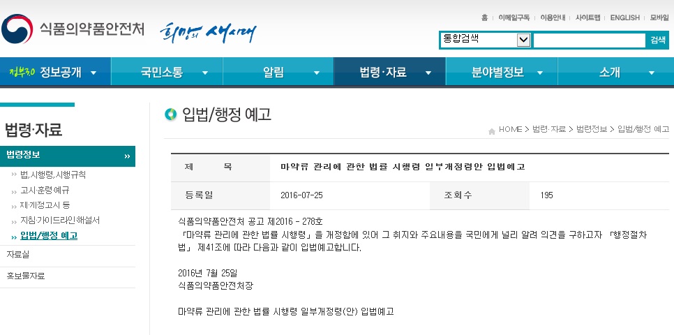 [한의신문=강환웅 기자]식품의약품안전처(이하 식약처)는 임시마약류 중 의존성이 입증된 16개 물질을 마약류로 지정하고 과징금 산정기준을 합리적으로 조정하는 것을 주요 내용으로 하는 '마약류 관리에 관한 법률 시행령' 일부 개정안을 지난 25일 입법예고했다.