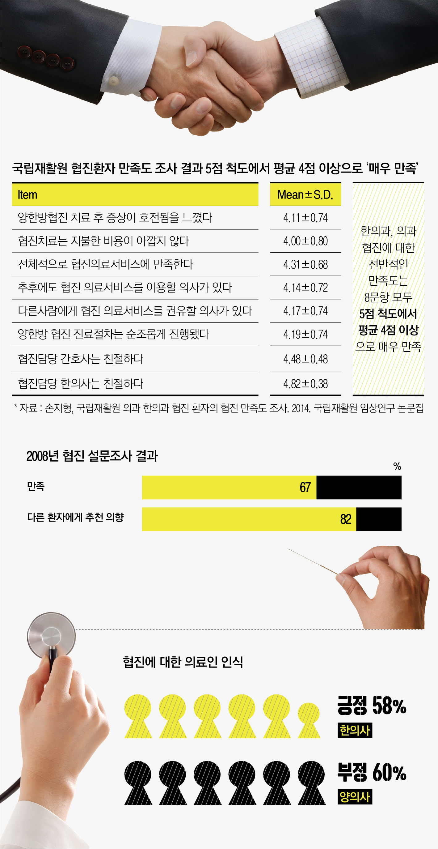 ‘국립재활원 의과, 한의과 협진 환자의 협진 만족도 조사’(2014년, 국립재활원 임상연구 논문집)에서도 한의과, 의과 협진 병원에 대해 87.2%가 계속 이용할 의사가 있다고 밝혔으며 협진에 대한 전반적 만족도는 5점 척도에서 평균 4점 이상으로 매우 만족스러워 했다.