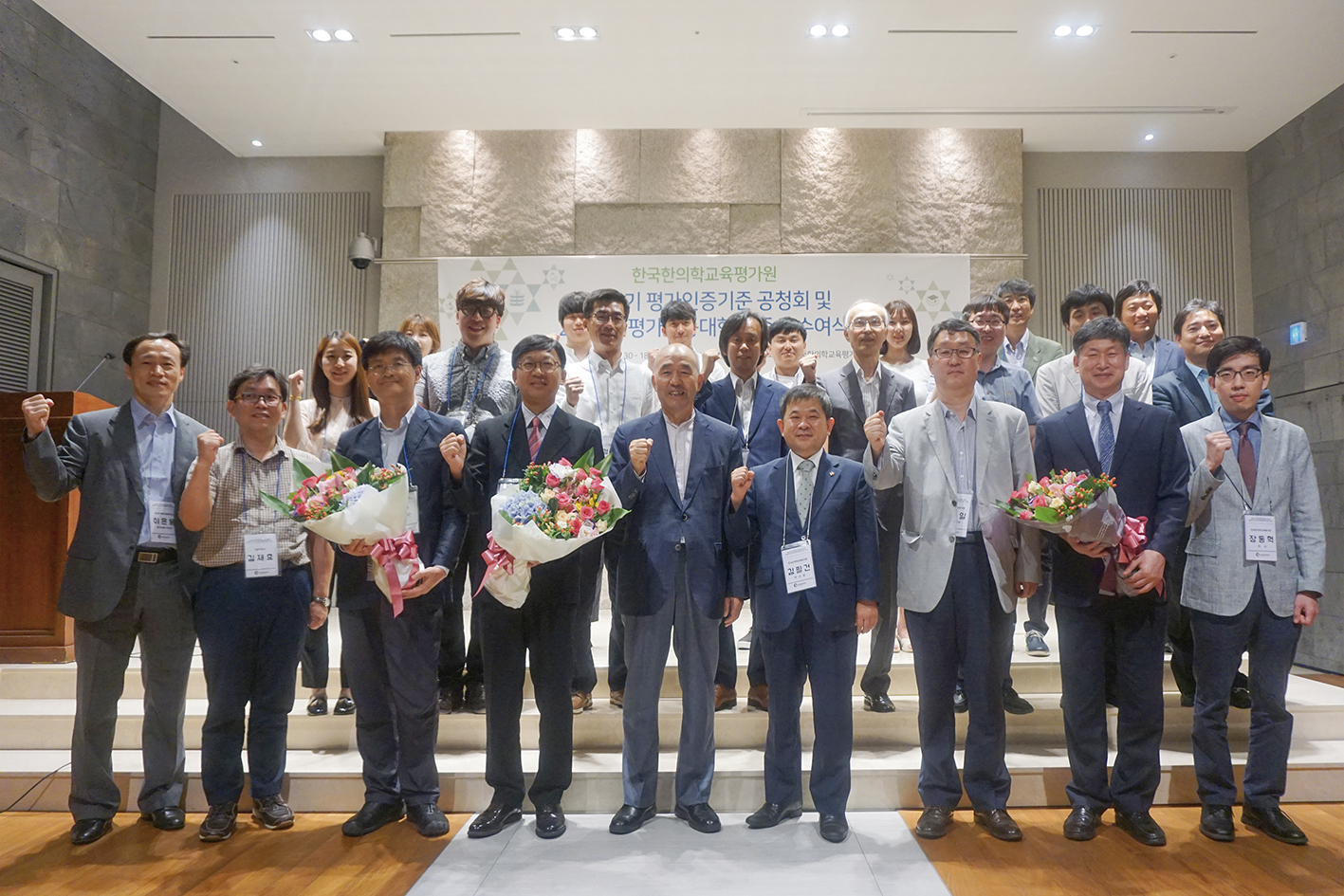 제2주기 평가·인증기준 공청회에 참여한 한평원 관계자와 각 한의과대학장이 지난 21일 오후 LW 컨벤션에서 인증서 수여식 후 기념촬영을 하고 있다.