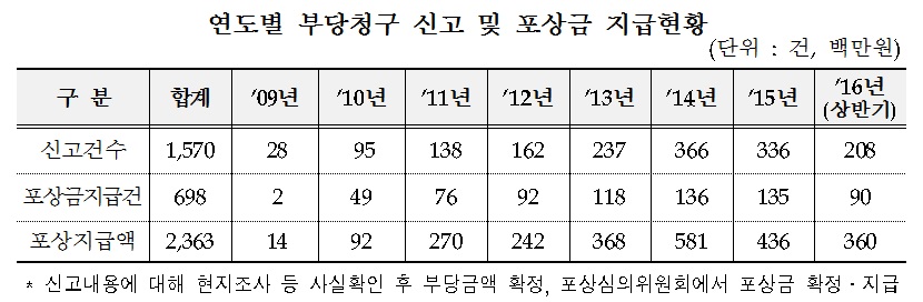 올해부터는 내부종사자의 신고포상금 지급한도를 5000만원에서 2억원으로 상향조정해 운영하고 있으며 포상금은 부당금액의 규모에 따라 신고인별(내부종사자, 수급자 ․ 가족, 일반인)로 구분해 지급하고 있다.