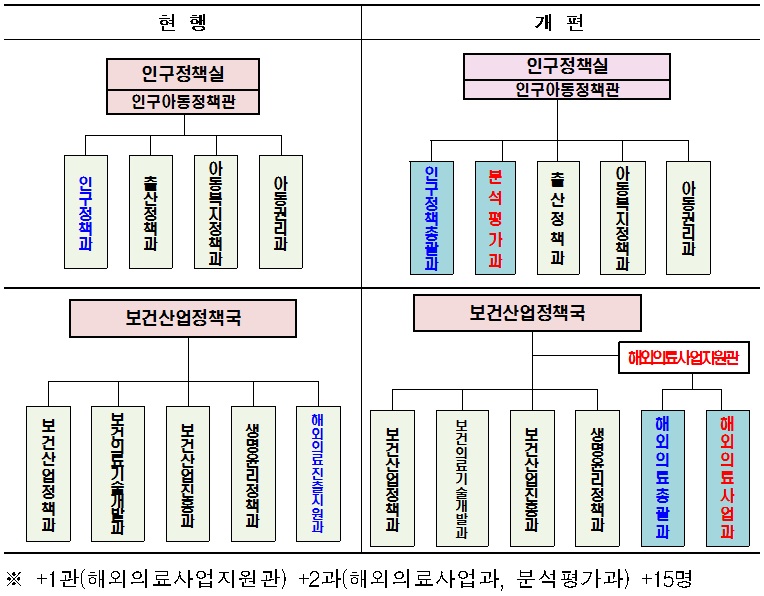 기존의 보건산업정책국 아래 해외의료진출지원과는 ‘해외의료총괄과’로 번경되고 의료 해외진출 및 외국인환자 유치에 관한 사항과 중동·아프리카 지역에 대한 업무를 수행하게 된다.