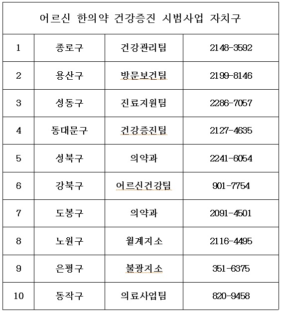 10개 자치구(종로, 용산, 성동, 동대문, 성북, 강북, 도봉, 노원, 은평, 동작구)와 지역내 한의원 150개소가 참여하는 ‘어르신 한의약 건강증진’ 시범사업은 무료 건강상담과 치매, 우울예방 관리를 위한 대상자별 차별화된 프로그램으로 구성돼 있다.